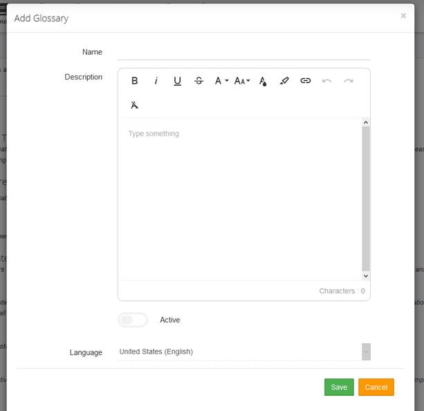 - From the Glossary page you can see all of the items listed alphabetically, and you can also search, filter, and add your own glossary terms.