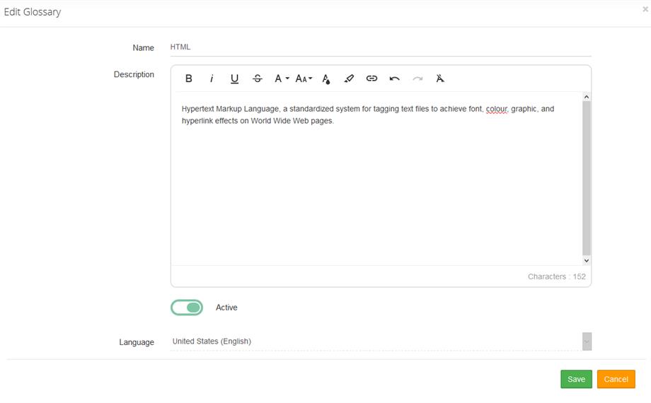 - In the Edit Glossary box, make the necessary modifications to the Name, Description, Active, and Language fields.